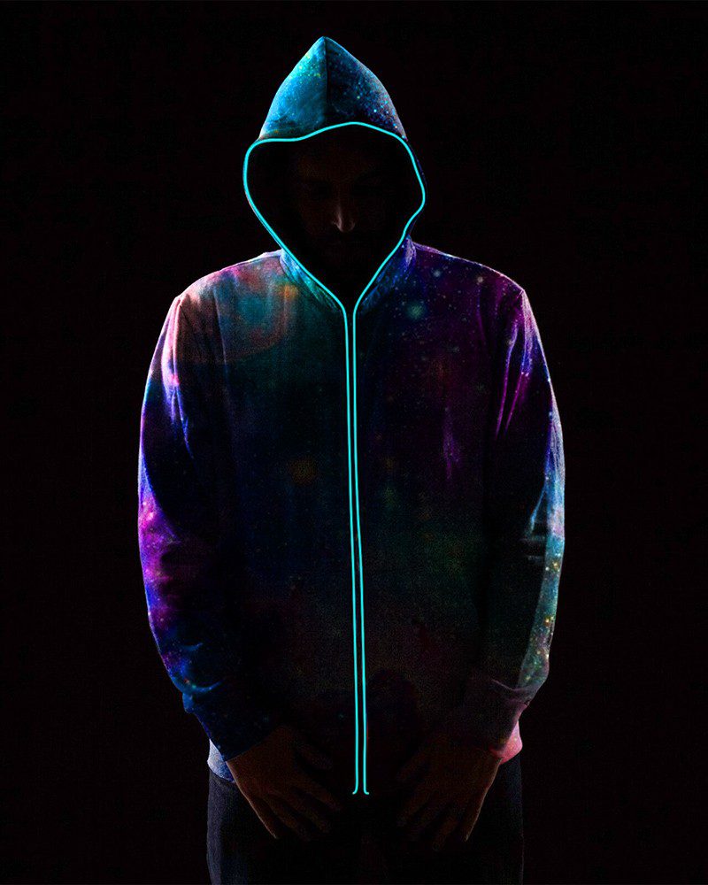 ELECTROLUMINESCENT WIRE: Stand out like never before with this unique light up hoodie. During the day, you can wear it like normal, and at night, you can turn on the lights to become the life of the party. The hoodie features a hidden controller with 3 modes: on/off, fast blinking, and slow blinking.