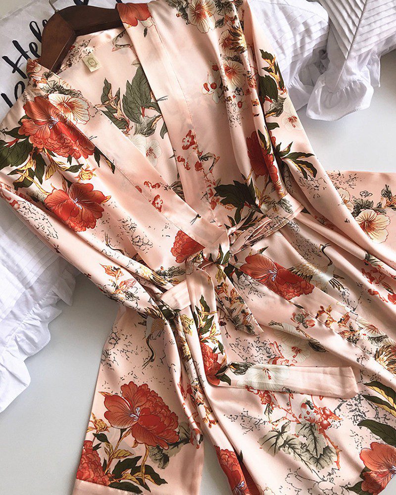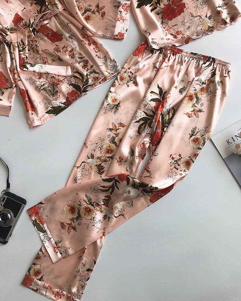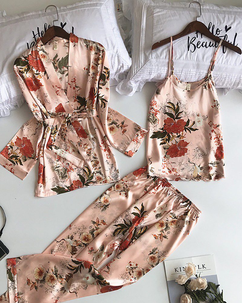 3PCS Floral Print Satin Robe Set