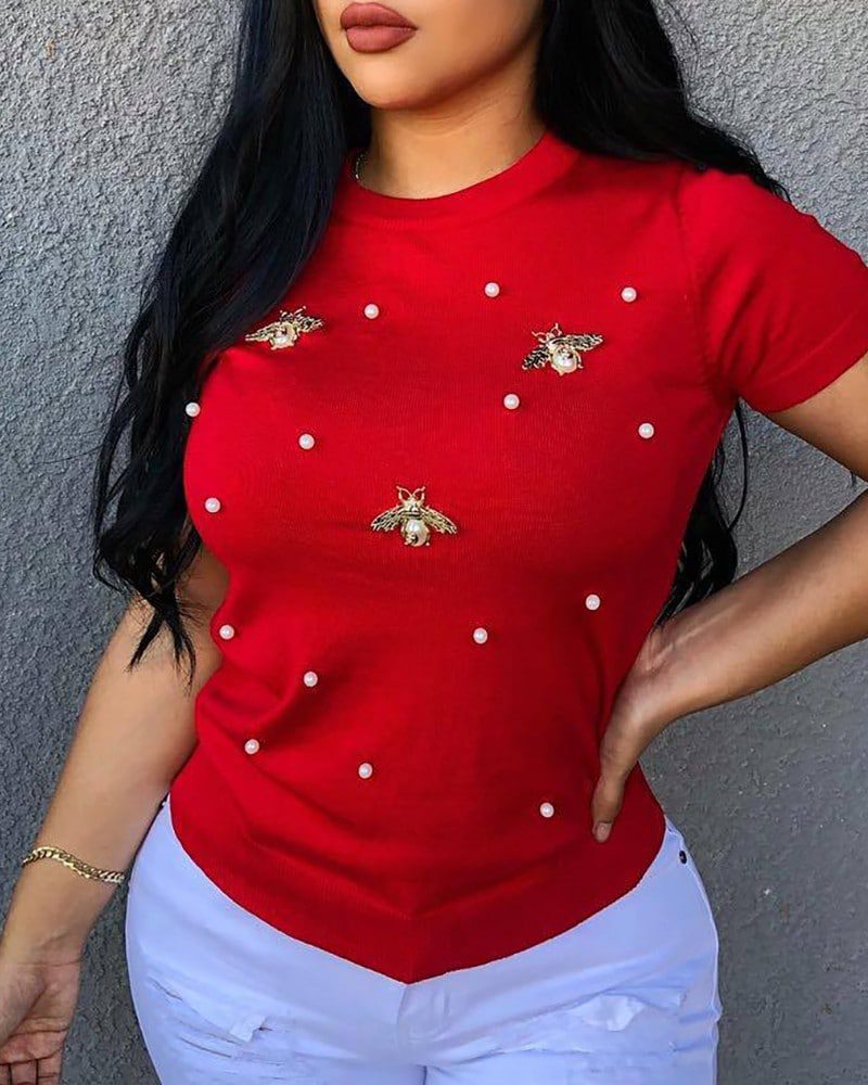 Style: Casual,Basics,Chic Material: Polyester Neckline: Round Neck Sleeve Style: Short Sleeve Length: Regular Pattern Type: Beaded,Butterfly Fit Type: Regular Occasion: Daily Package Include: 1*T-Shirt Note:There might be 2-3% difference according to manual measurement.Please check the measurement chart carefully before you buy the item.+Please note that slight color difference should be acceptable due to the light and screen.