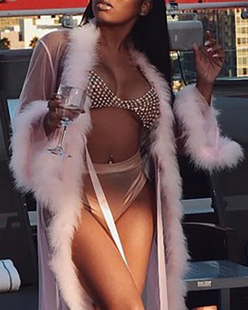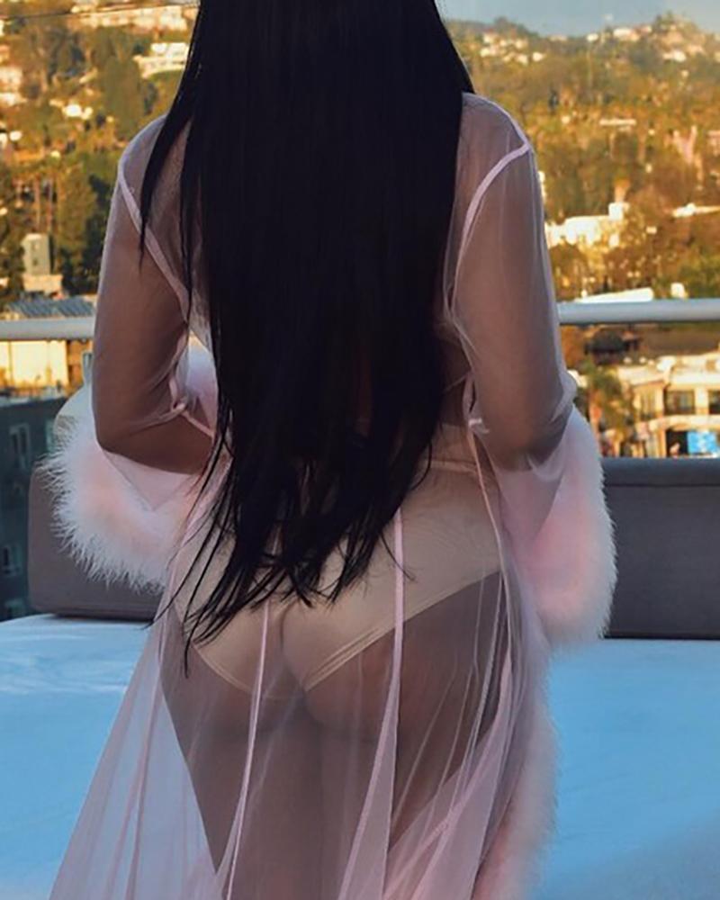 Feather Detail Mesh Plain Robe With Panty