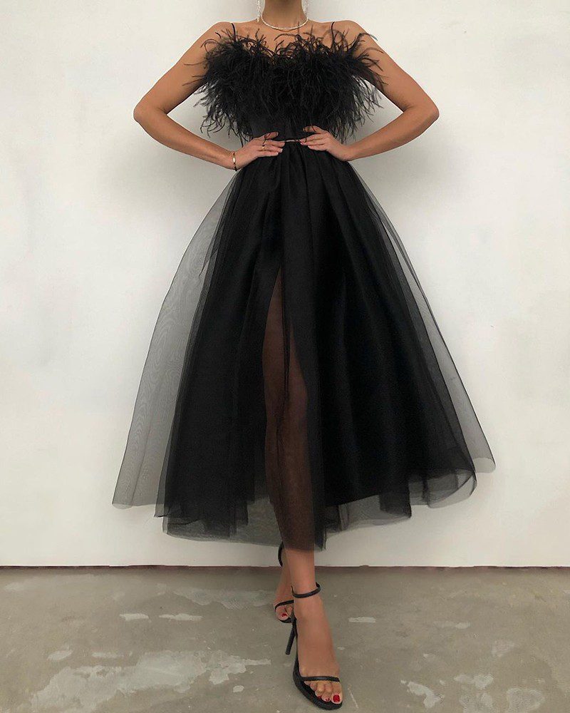 Feather Detail Off Shoulder Sheer Mesh Dress