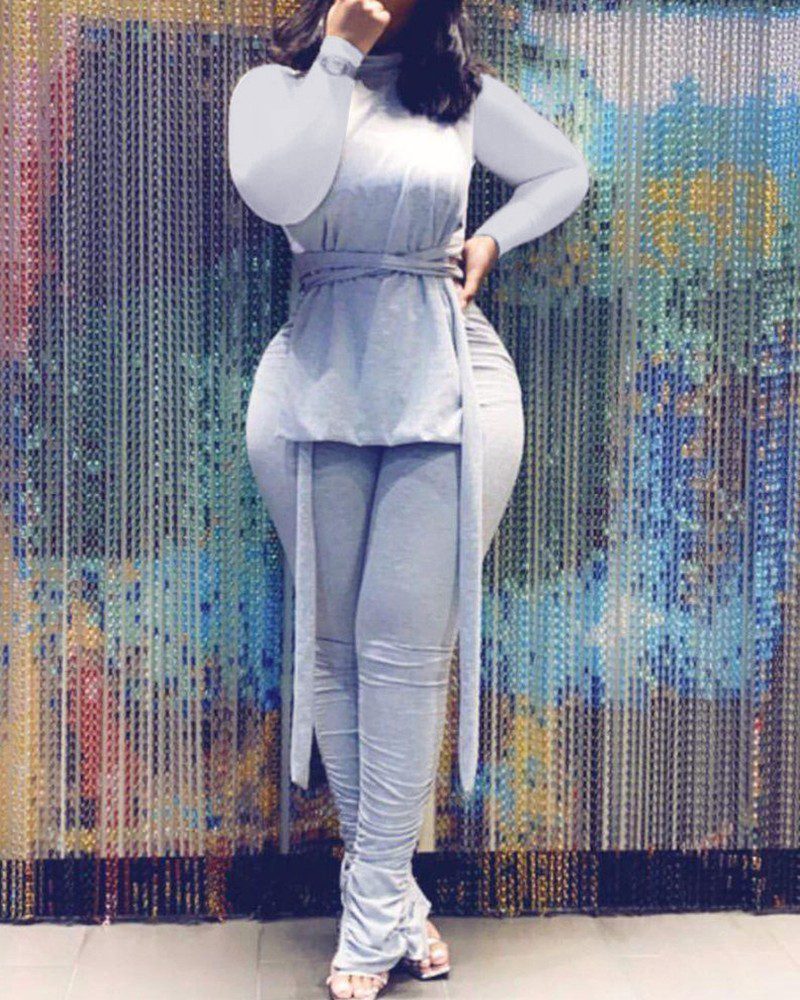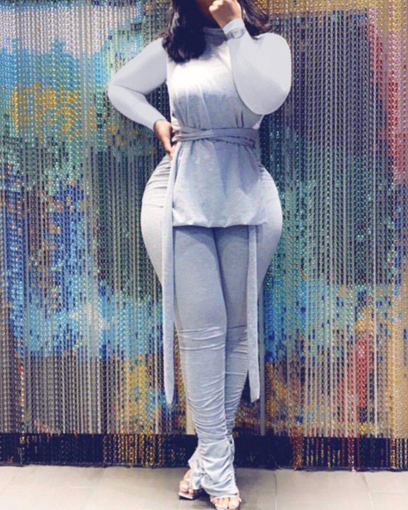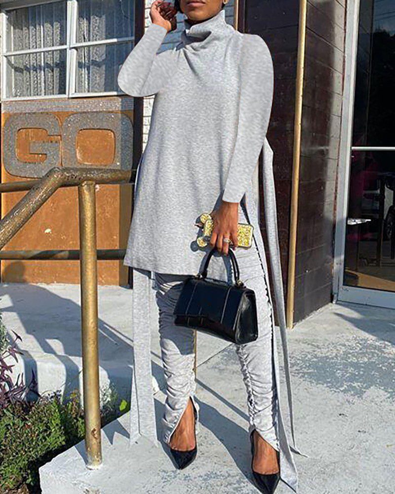 Plain Tie Detail Long Sleeve Top & Slit Fold Pants Set